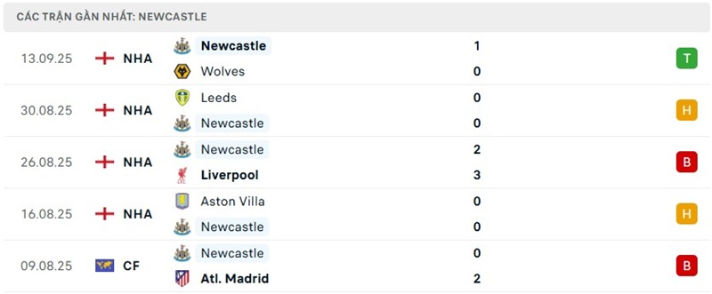 Thành tích đối đầu giữa Bournemouth vs Newcastle
