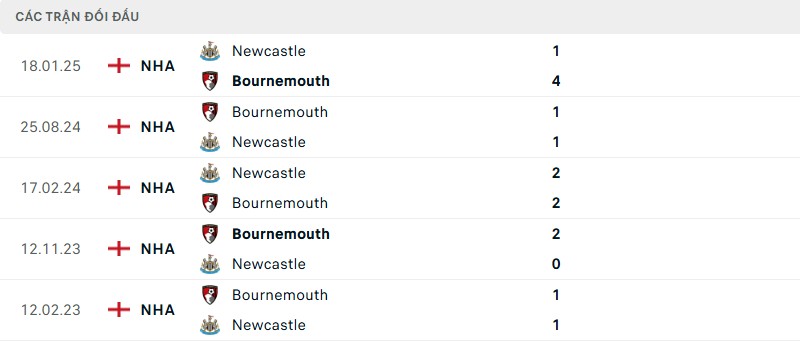 Thành tích đối đầu giữa Bournemouth với Newcastle
