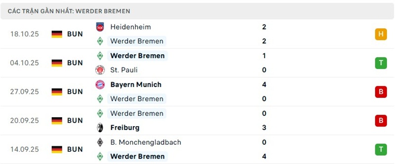 Điểm sáng của Bremen là hàng công đã ghi được 11 bàn, nhưng hàng thủ lại là nỗi lo lớn khi để thủng lưới tới 16 lần. Dù vậy, thống kê cho thấy Bremen thi đấu rất kiên cường tại Wohninvest Weserstadion. Việc đang có chuỗi 6 trận bất bại ấn tượng trong 7 trận sân nhà gần nhất tại mọi đấu trường sẽ là điểm tựa tinh thần và lợi thế cực lớn cho họ trong cuộc đối đầu quan trọng này.