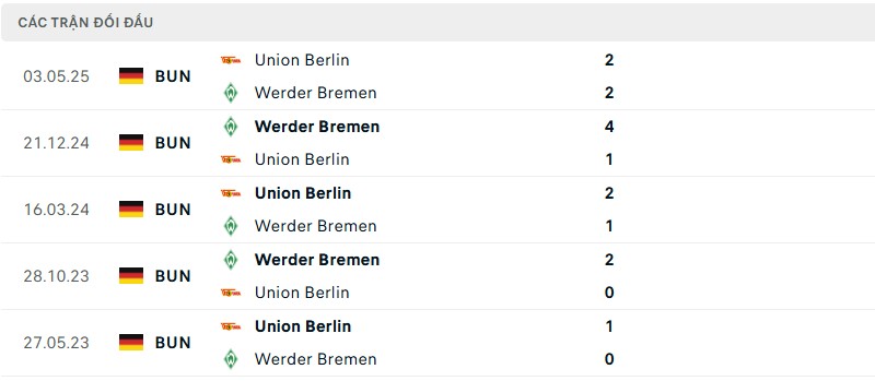 Lịch sử đối đầu khá cân bằng khi Union Berlin nhỉnh hơn chút với 3/6 chiến thắng gần nhất. Tuy nhiên, Bremen lại có lợi thế khi chơi tại Wohninvest Weserstadion. Đáng chú ý, các trận đấu gần đây thường có nhiều bàn thắng, với cả 3 lần gặp nhau gần nhất đều kết thúc với trên 2.5 bàn.